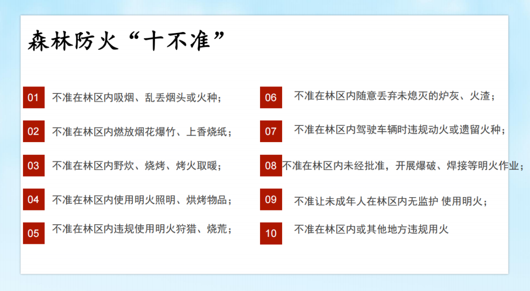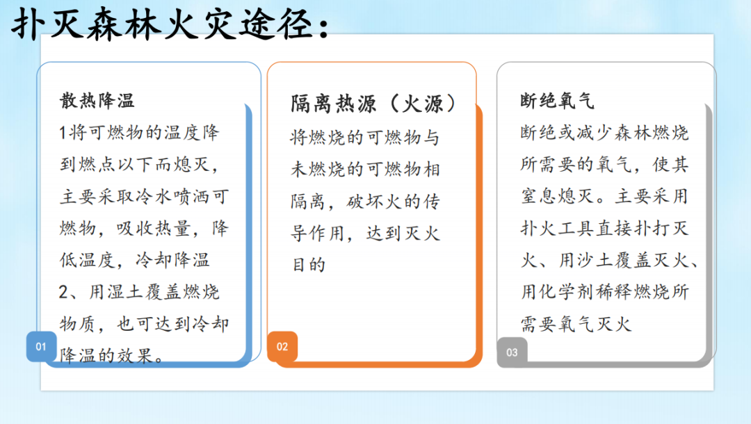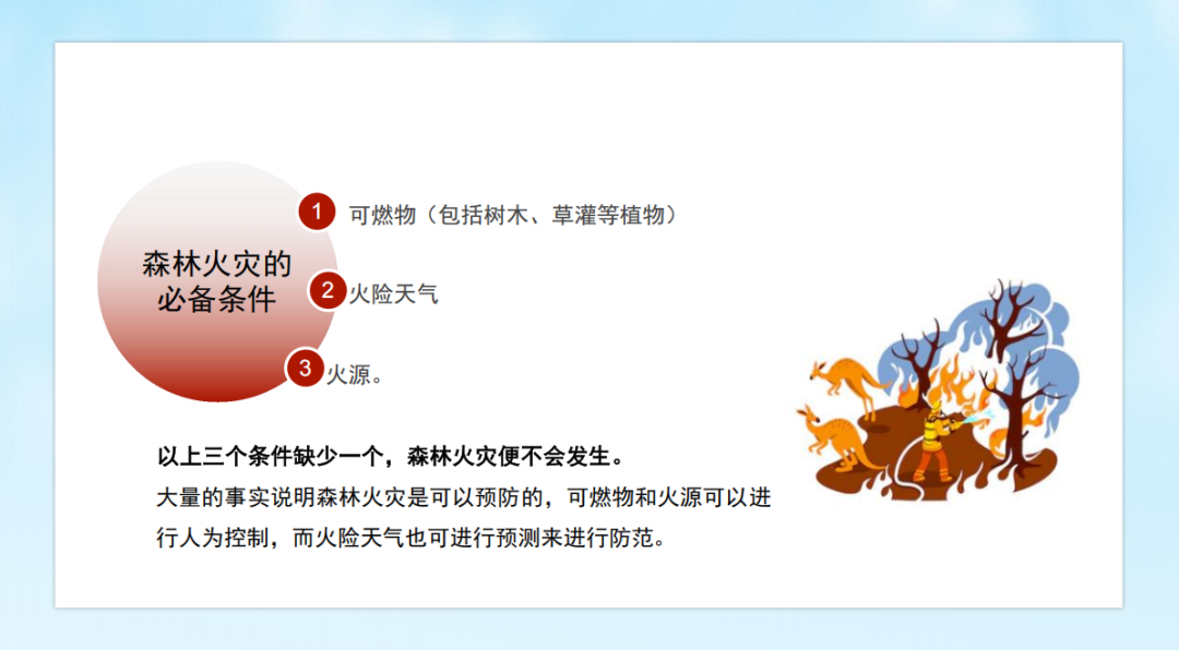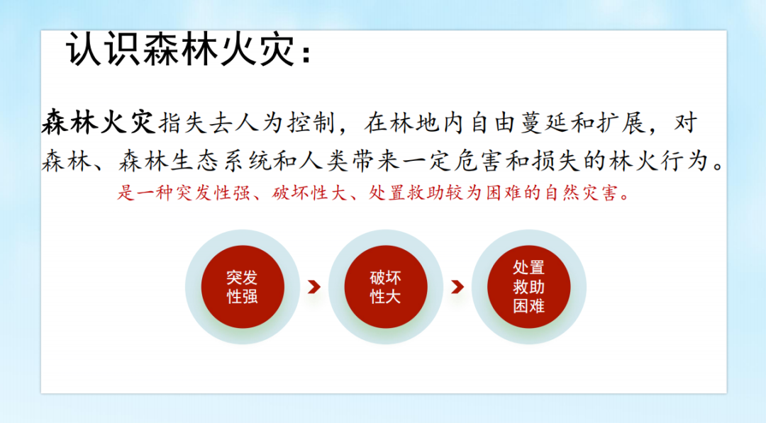 ▪认识火灾风险:深入解析森林火灾“突发性强、破坏性大、处置难度高”的特点,详解火灾形成的三大要素(可燃物、火险天气、火源),以及人为、自然等常见起火原因,让大家深刻认识到火灾的严重危害。
